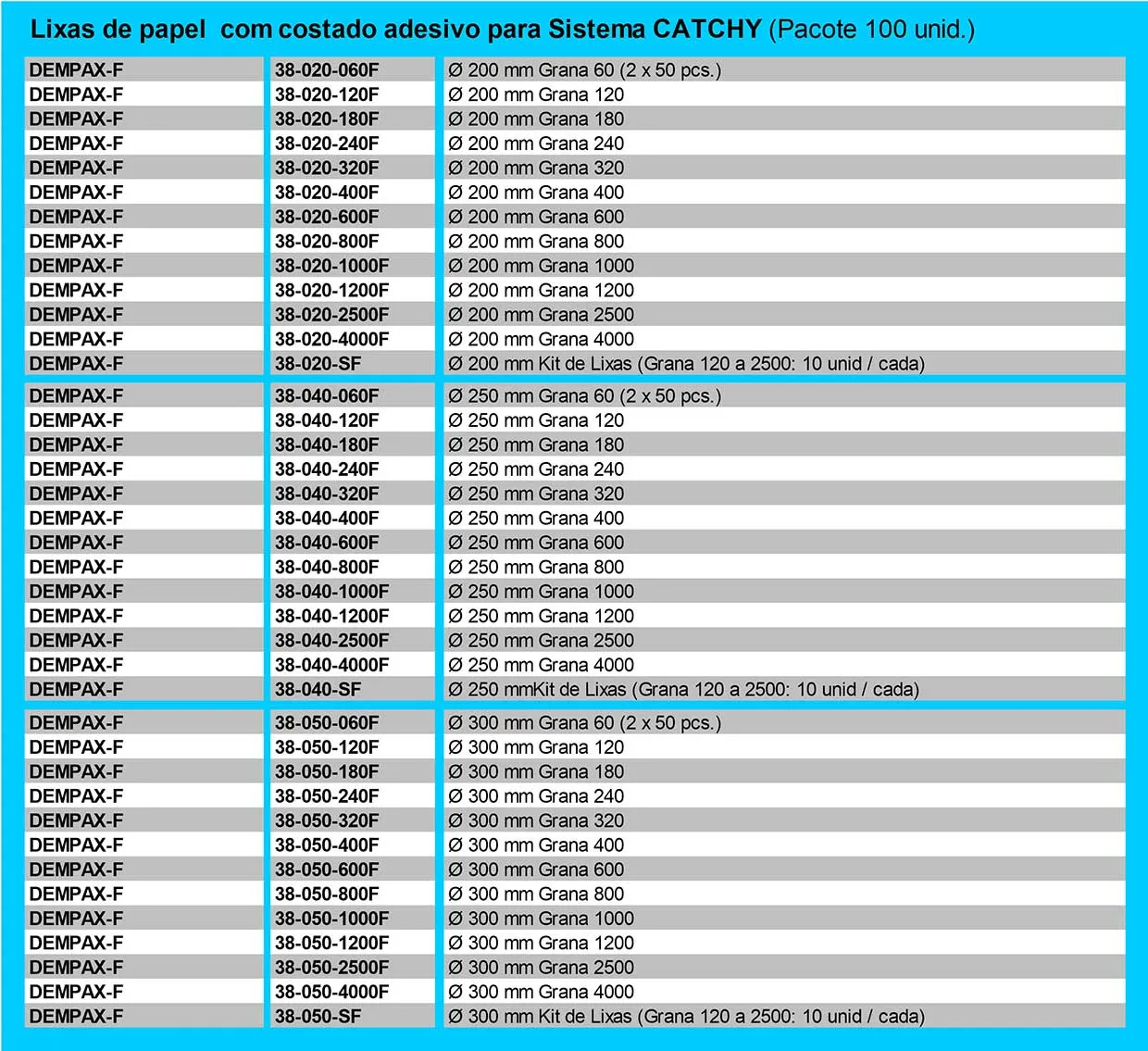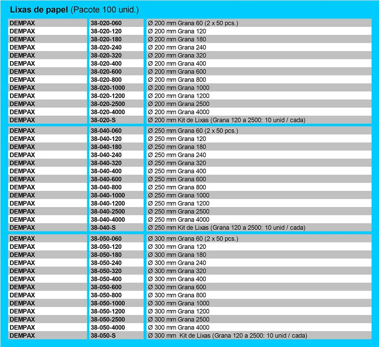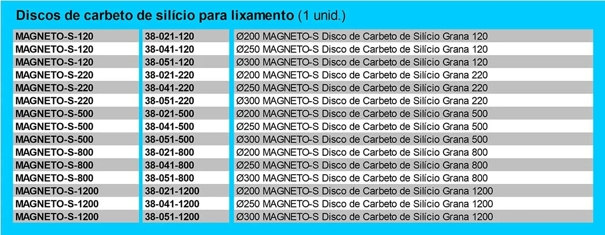 Oferecemos uma linha completa de lixas para desbastar amostras metalográficas nos diâmetros de 200, 250 e 300 mm e granulometrias de 60 a 4000, com opções em papel e adesiva, além de rebolos abrasivos.